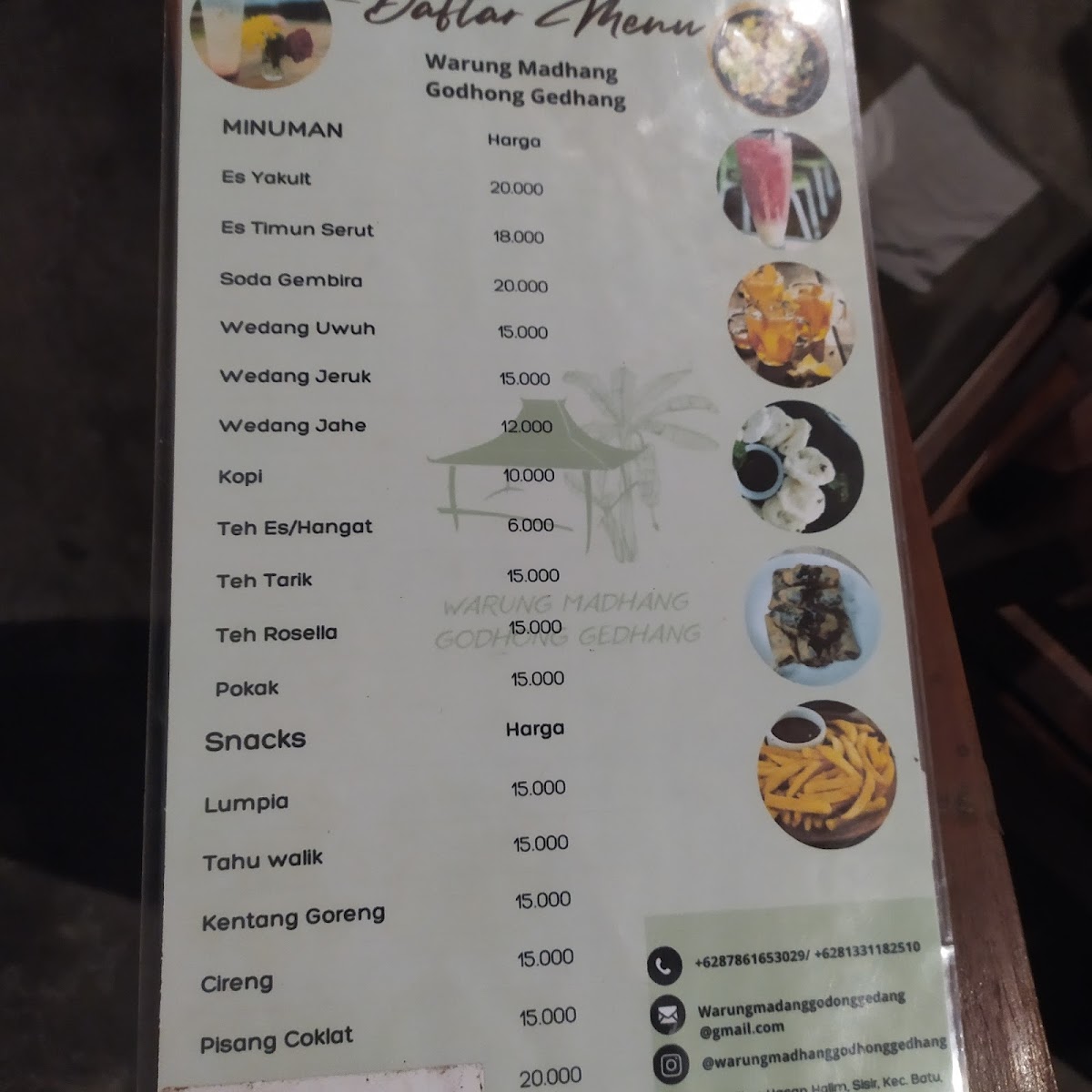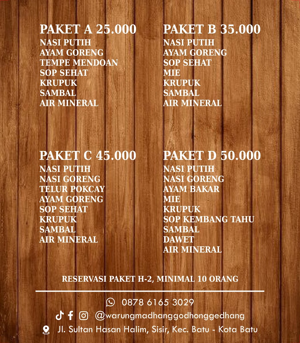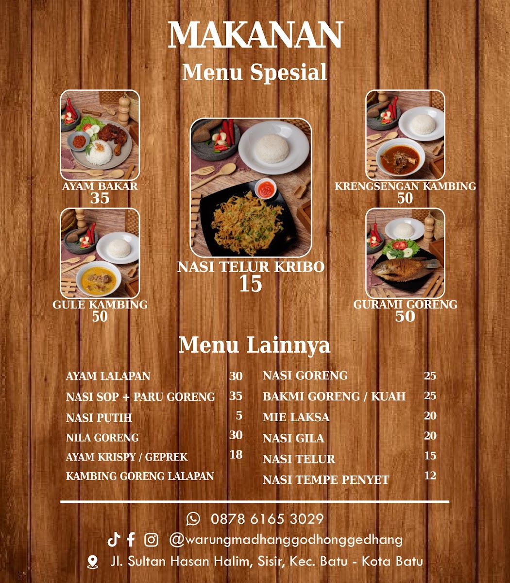 The menu highlights include Ayam Bakar, tender grilled chicken infused with smoky char; Krengsengan Kambing and Gule Kambing, showcasing slow-cooked goat in savory, aromatic sauces; and the crispy, golden Gurami Goreng, a fried fish delicacy beloved across the region. Another must-try is Nasi Telur Kribo, a comforting rice dish paired with uniquely textured eggs.
